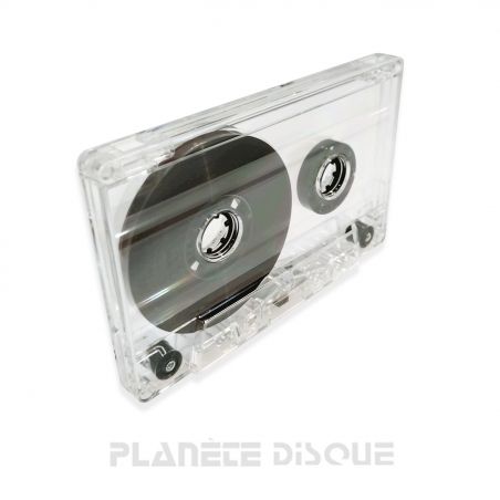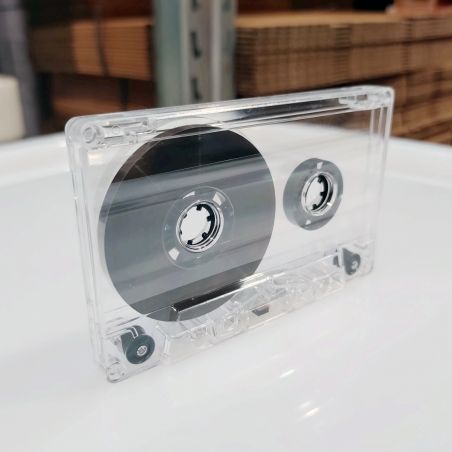 Transparent audio cassette, loaded with high-quality Ferro tape. Duration 90 minutes. Without plastic tab in the writing protection hole, to record it must be closed with a piece of tape or something similar. Black rolls and guides. Newly manufactured, no old stock. Packing: 1 piece.