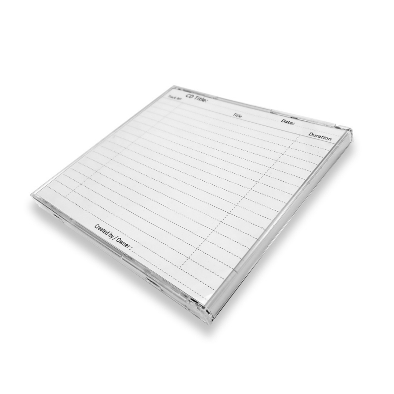 Utiliza nuestras resistentes tarjetas para escribir a mano los títulos de las canciones que has grabado en el CD. La tarjeta trasera cabe fácilmente en una caja de CD gracias a los 2 pliegues preplegados. Fabricadas en cartulina blanca lisa de 280 g/m2. Impresa con: título del CD, fecha, número de la pista, título de la canción, duración y nombre del propietario del CD. Fabricado en Bélgica. Dimensiones de la tarjeta trasera: ancho 151 x alto 117,5 mm, dimensiones de la tarjeta delantera (sin imprimir) 121,5 x 121,5 mm. Tamaño del paquete: 10 tarjetas traseras y 10 tarjetas delanteras.