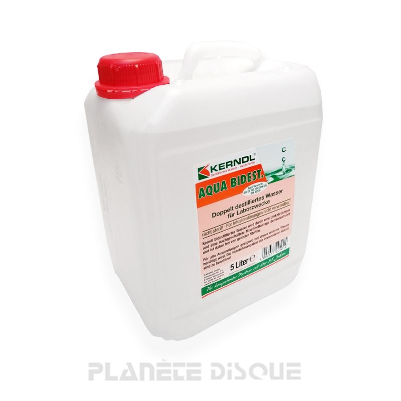 Agua bidestilada como la utilizada en laboratorios no médicos. Alta pureza, ideal como base en mezclas para la limpieza de discos de vinilo, por ejemplo con Art du Son, Knosti Ultrason u Okki Nokki ®, o para enjuagar los discos después de la limpieza manual. Fabricada en Alemania. Esta agua no debe utilizarse con fines alimentarios. Contenido: bidón de 5 litros, tapón de rosca con anillo de garantía.