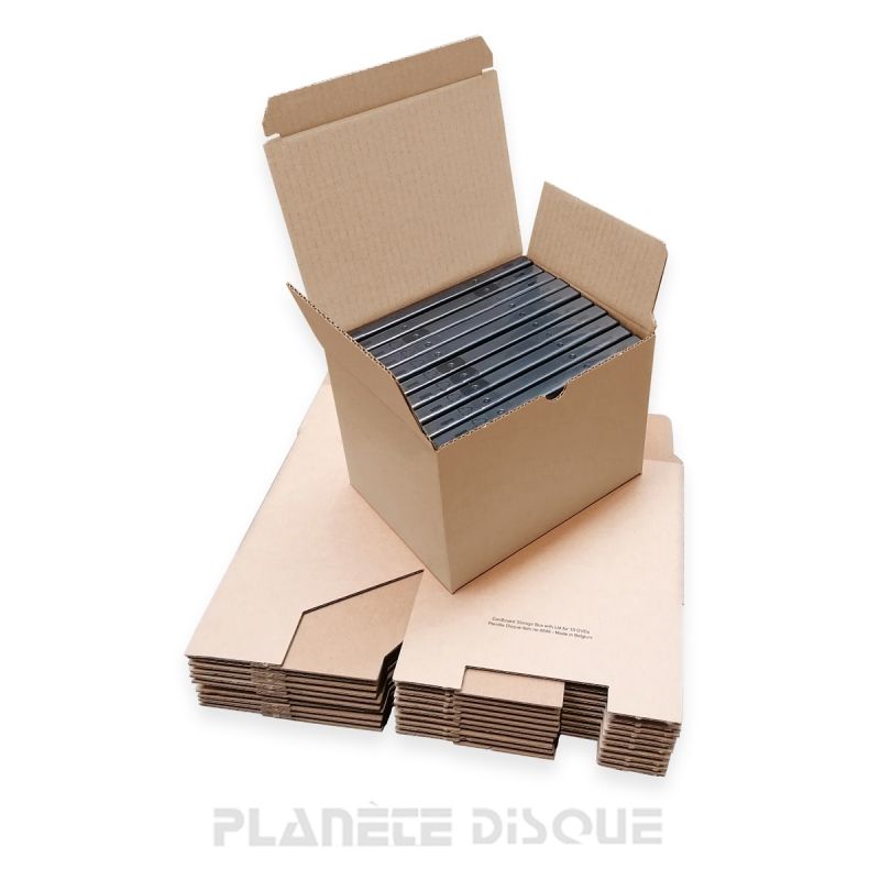Robusta caja kraftliner con fondo semiautomático con capacidad para 10 cajas de DVD. Se monta en pocos pasos gracias a los elementos de base encajables. Gracias a la tapa no se necesita cinta adhesiva y facilita el acceso a los DVD. Esta caja puede utilizarse para archivar, almacenar y enviar. Embalaje: 10 unidades. Peso por unidad: 100 gramos. Dimensiones interiores: anchura 195 mm x profundidad 150 mm x altura 140 mm. Producto ecológico diseñado por Planète Disque y fabricado en Bélgica.
