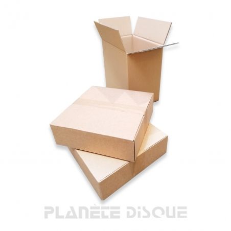 Paquete de 3 cajas de cartón (kraft muy resistente) para el envío de aproximadamente 40 discos de vinilo 33 rpm. Contenido: 2 cajas de canal simple (319 x 319 x 93 mm) con 20 discos cada una, que se guardan verticalmente en una caja de canal doble (332 x 222 x 333 mm). Las discográficas estadounidenses envían sus discos de esta forma.