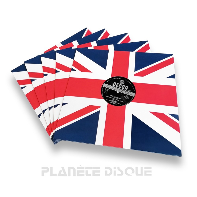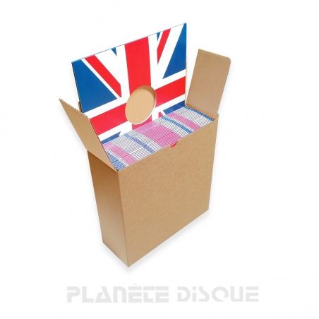 Fundas de cartón para LP 33 rpm con motivo de bandera del Reino Unido. Cartón liso y rígido con un peso de 300 gr/m², doble orificio de 100 mm, dorso de 3 mm, dimensiones: 315 x 315 mm, peso por pieza: aproximadamente 56 gramos, embalaje: 1 lote = 25 piezas (embaladas en una ref 1046B). Fabricado en Alemania con los más altos estándares de calidad.