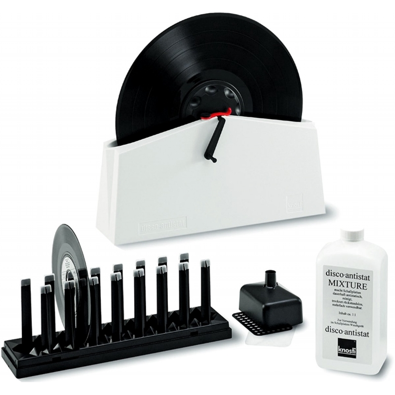 Incluido en el precio: bandeja para la lavadora de discos, provista de dos cepillos finos de pelo de cabra, carcasa de plástico con husillo y juntas de goma para proteger las etiquetas de los discos, botella con Disco-Antistat-Mixture para el lavado y tratamiento, embudo para llenar el frasco después de utilizar la lavadora de discos, escurridor para 15 discos.