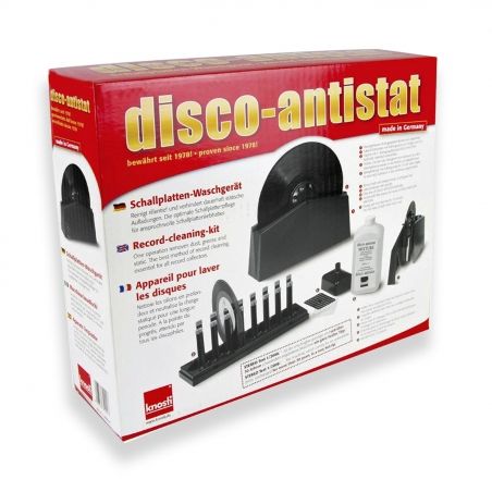 Le fameux "Disco-Antistat" de la marque Knosti, sur le marché depuis 1978 est fabriqué en Allemagne. L'appareil assure un nettoyage des sillons en profondeur et neutralise la charge statique pour une longue période. Compris dans le prix : bac de la machine à laver les disques, muni d'une fine brosse en poils de chèvre, coquille plastique avec axe protégeant les étiquettes du disque, flacon avec le mélange Disco-Antistat-Mixture pour le lavage et le traitement, entonnoir pour le remplissage du flacon après utilisation de la machine à laver les disques, égouttoir pour 8 disques.