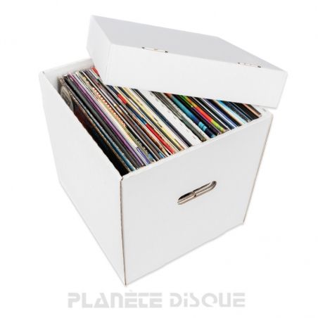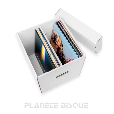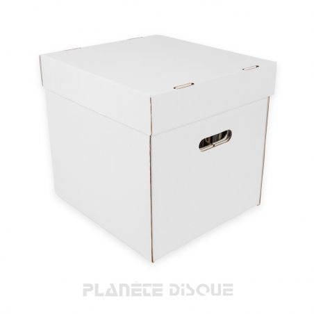 Boîte en carton blanc pour ranger ou transporter environ 60 disques vinyles 33 tours. Elle est parfaitement compatible avec les armoires IKEA Kallax (TM) et Expedit (TM). Elle est facile à porter grâce aux 2 poignées découpées. La boîte est divisée en deux compartiments, chacun pouvant contenir 30 disques. Elle est équipée d'un couvercle qui coiffe complètement la boîte.